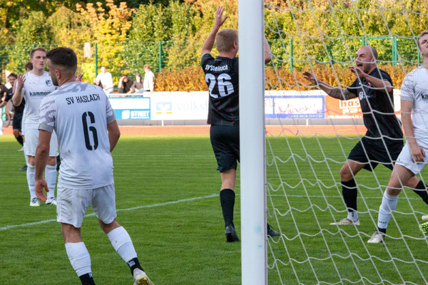 Die Partie begann in den ersten Minuten mit einem leichten Übergewicht der Haslacher, die früh pressten und durch Kapitän Maximilian Armbruster den ersten abgeblockten Torschuss verzeichneten (7.). Nach einer ersten Chance der Gäste durch einen Kopfball von Julian Neumaier (13.) entwickelte sich ein ausgeglichenes Spiel. Dennoch nutzten die Hausherren die Fehler der Steinacher Defensive konsequent aus. In der 29. Minute bekam die Steinacher Defensive den Ball nicht endgültig geklärt. Das Leder landete bei Giulio Tamburello, der zum 1:0 für die Gastgeber traf. Obwohl Robin Blum (35.) nur kurz darauf den möglichen Ausgleich verpasste, fehlte dem SVS in dieser Phase die letzte Konsequenz.