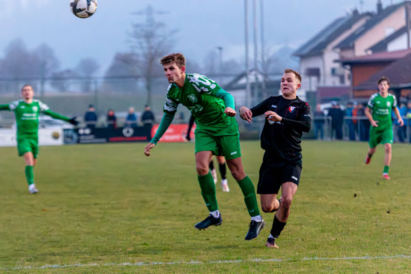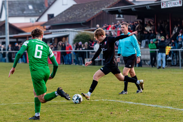 Das Derby begann mit leichten Vorteilen für die Gäste. Die Mühlenbacher, hochmotiviert und aggressiv in den Zweikämpfen, versuchten früh, den Schneid abzukaufen. Die Hausherren waren zwar um Spielkontrolle bemüht, mussten aber erst in die Partie finden. Das erste Ausrufezeichen setzte dennoch der SVS. In der siebten Minute segelte eine Flanke von Fabio Vögele in den Strafraum, wo der aktuell formstarke Kai Schwendemann zum Kopfball kam, das Tor jedoch knapp verfehlte. Nach einem ersten harmlosen Warnschuss der Gäste durch Jannik Maier (11.) übernahm die Allgaier-Elf nach einer Viertelstunde zusehends das Kommando und zeigte nun den erhofften reifen Auftritt.
